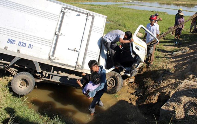Đang lưu thông trên tỉnh lộ, chiếc xe tải bất ngờ mất lái rồi lao thẳng xuống con mương dẫn nước bên đường. Người dân phải đập cửa kính đưa nạn nhân ra ngoài.