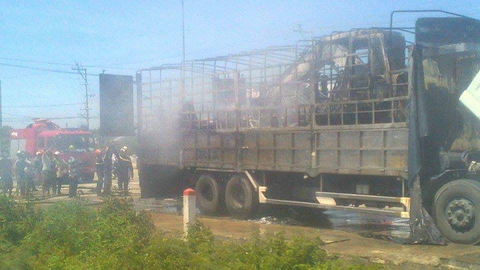 Chiếc xe tải thùng chở theo xe múc đang lưu thông trên QL1A bất ngờ bốc cháy dữ dội.